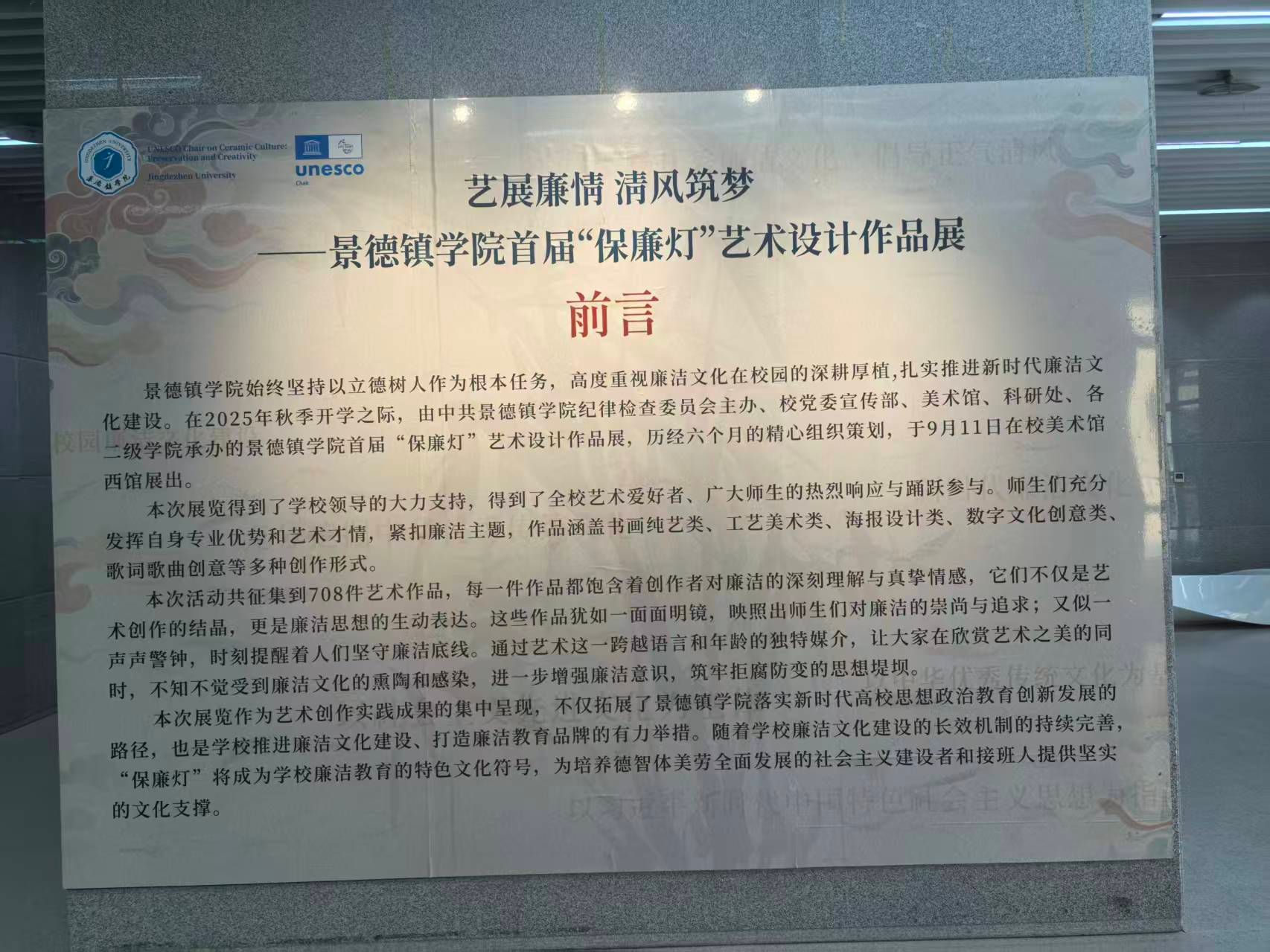此次“保廉灯”艺术设计作品展以“廉洁”为主题,汇集了来自全校师生的百余件优秀艺术设计作品,涵盖环境艺术、陶瓷艺术、数字媒体等多个专业方向。作品以独特的艺术视角和丰富的表现形式,深刻诠释了廉洁文化的内涵,弘扬了清风正气,充分展现了景德镇学院师生将专业教育与思想政治教育深度融合的创新成果。