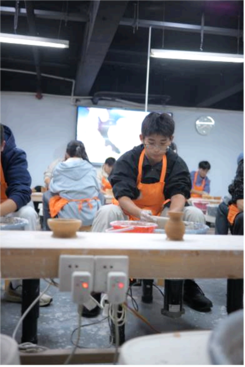 活动最后,陶艺体验环节在专业工坊内温馨开启。在牛海亮老师和雷鑫老师的细致示范与手把手指导下,同学们分组投入拉胚与塑形实践。拉坯区里,转盘缓缓转动,同学们屏息凝神,双手轻扶陶泥,在一次次调整与按压中,将松软的泥料塑造成古朴的碗、灵动的杯;在塑形台前,大家发挥创意,指尖翻飞,或捏出憨态可掬的小动物,或雕出简约雅致的花纹,让平凡的陶泥在掌心绽放出独特形态。亲身实践中,同学们不仅体会到拉坯时“稳、准、轻”的技艺要领,更在反复打磨、修正作品的过程中,深刻领悟到陶瓷制作的不易,读懂了“匠心”二字所蕴含的专注、坚持与精益求精。